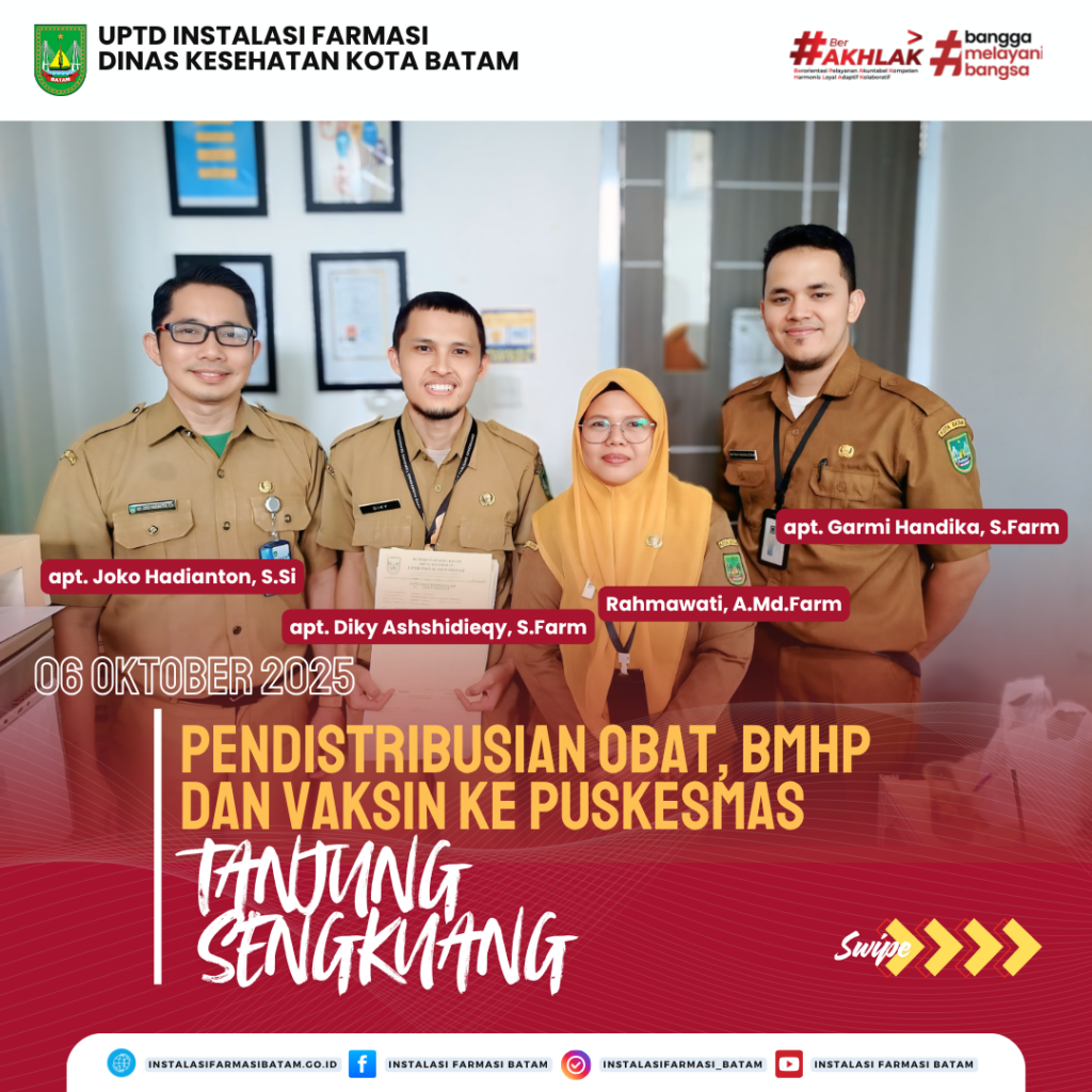 UPTD Instalasi Farmasi Dinas Kesehatan Kota Batam melakukan Pendistribusian Obat, Bahan Medis Habis Pakai (BMHP) dan Vaksin rutin ke Puskesmas Tanjung Sengkuang pada Senin, 06 Oktober 2025