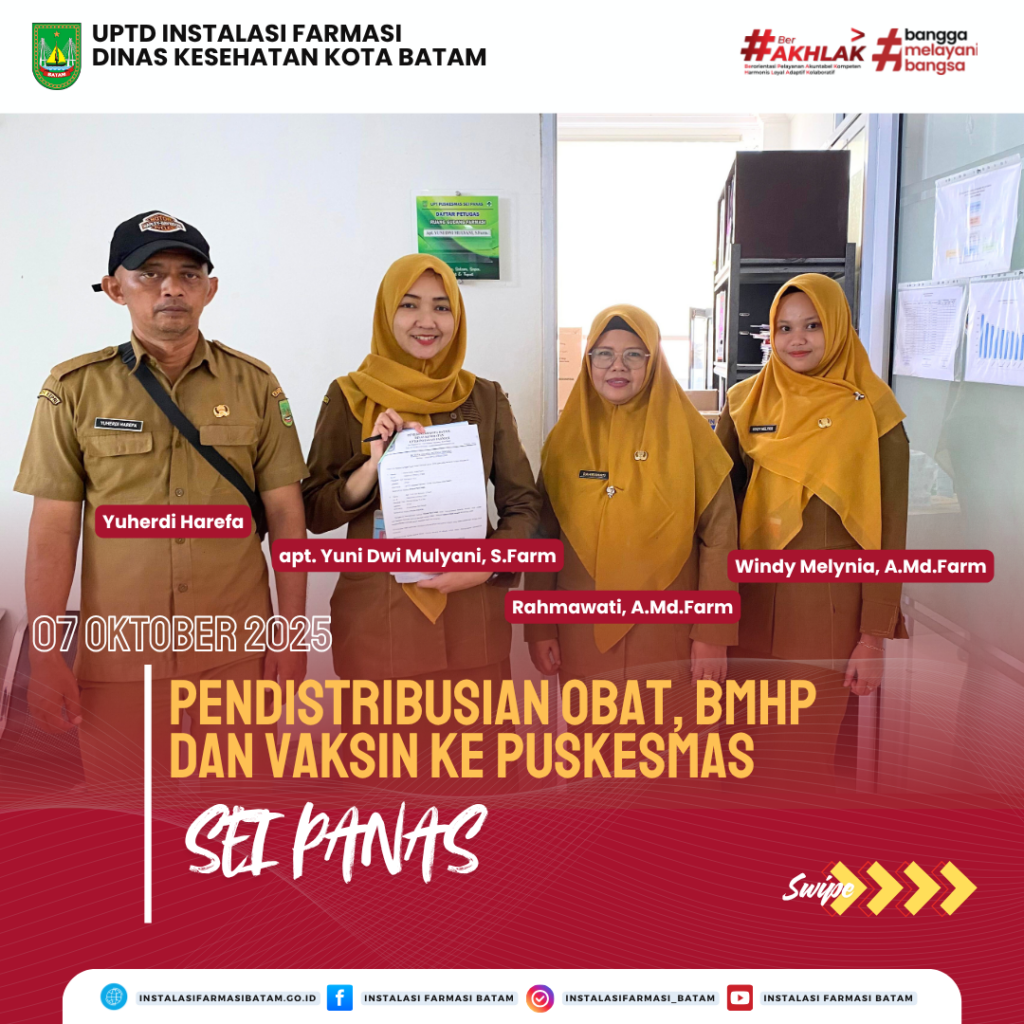 UPTD Instalasi Farmasi Dinas Kesehatan Kota Batam melakukan Pendistribusian Obat, Bahan Medis Habis Pakai (BMHP) dan Vaksin rutin ke Puskesmas Sei Panas pada Selasa, 07 Oktober 2025