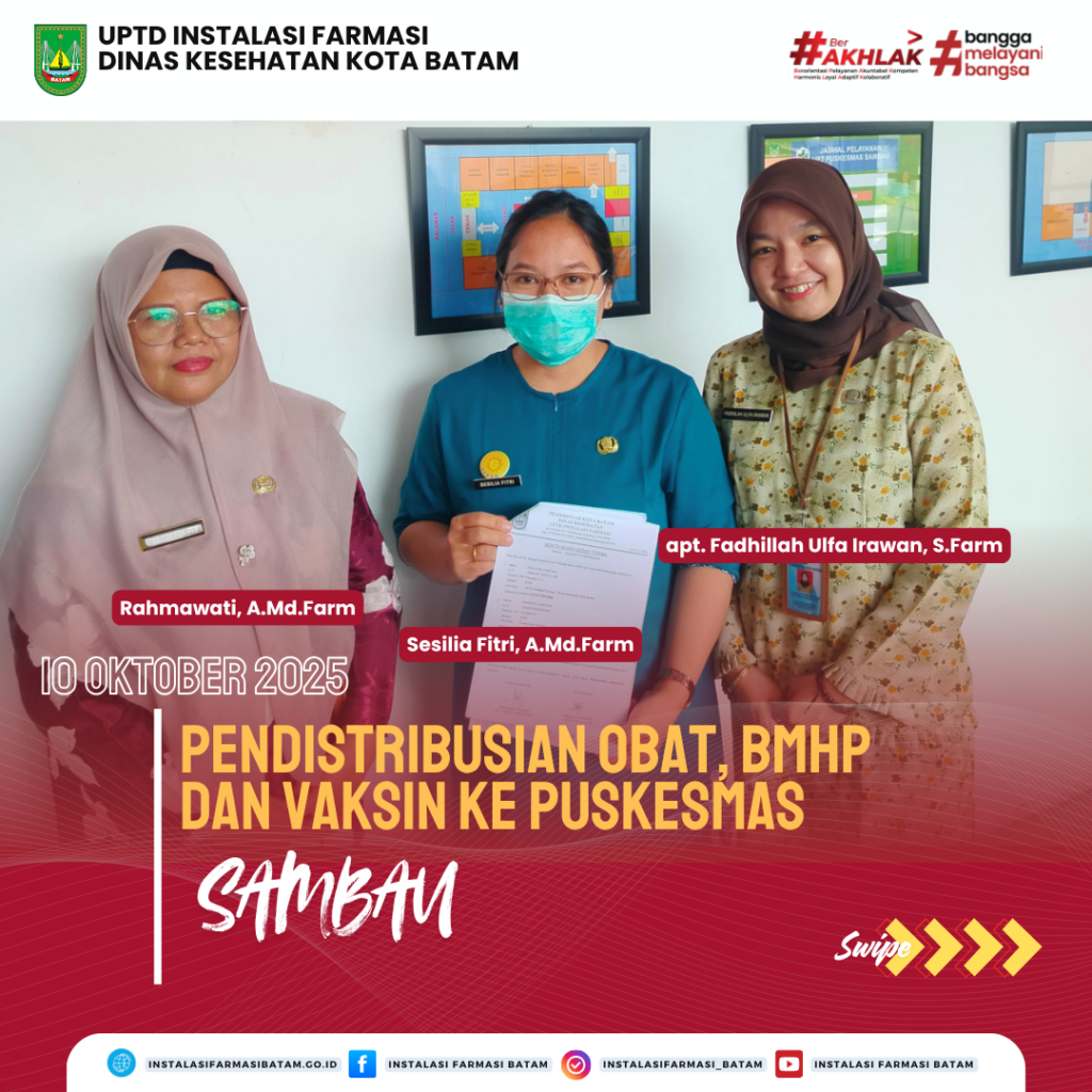 UPTD Instalasi Farmasi Dinas Kesehatan Kota Batam melakukan Pendistribusian Obat, Bahan Medis Habis Pakai (BMHP) dan Vaksin rutin ke Puskesmas Sambau pada Jumat, 10 Oktober 2025
