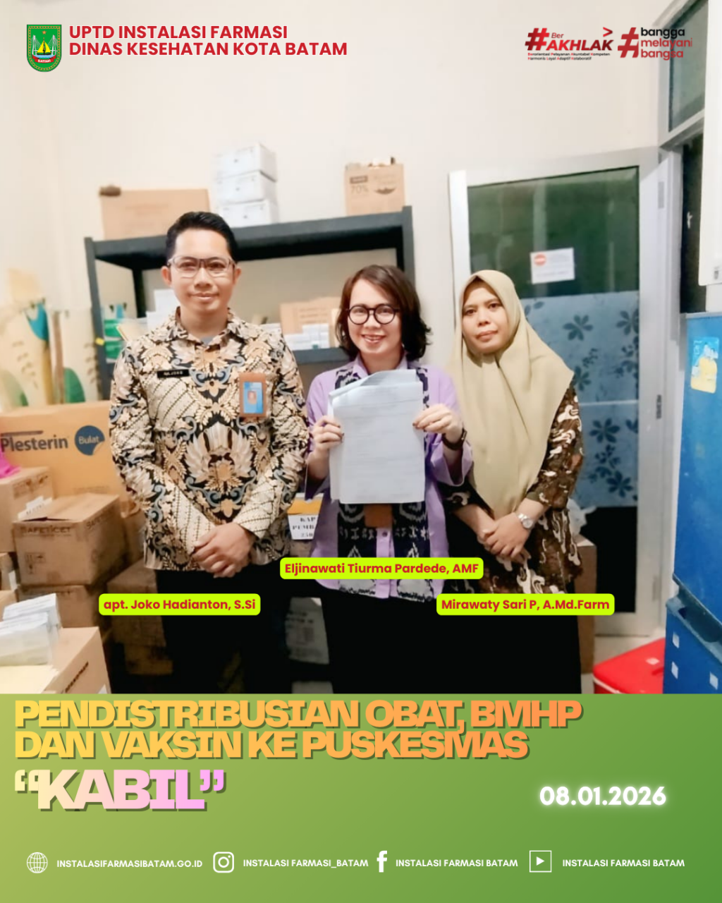 UPTD Instalasi Farmasi Dinas Kesehatan Kota Batam melakukan Pendistribusian Obat, Bahan Medis Habis Pakai (BMHP) dan Vaksin rutin ke Puskesmas Kabil pada Kamis, 08 Januari 2026