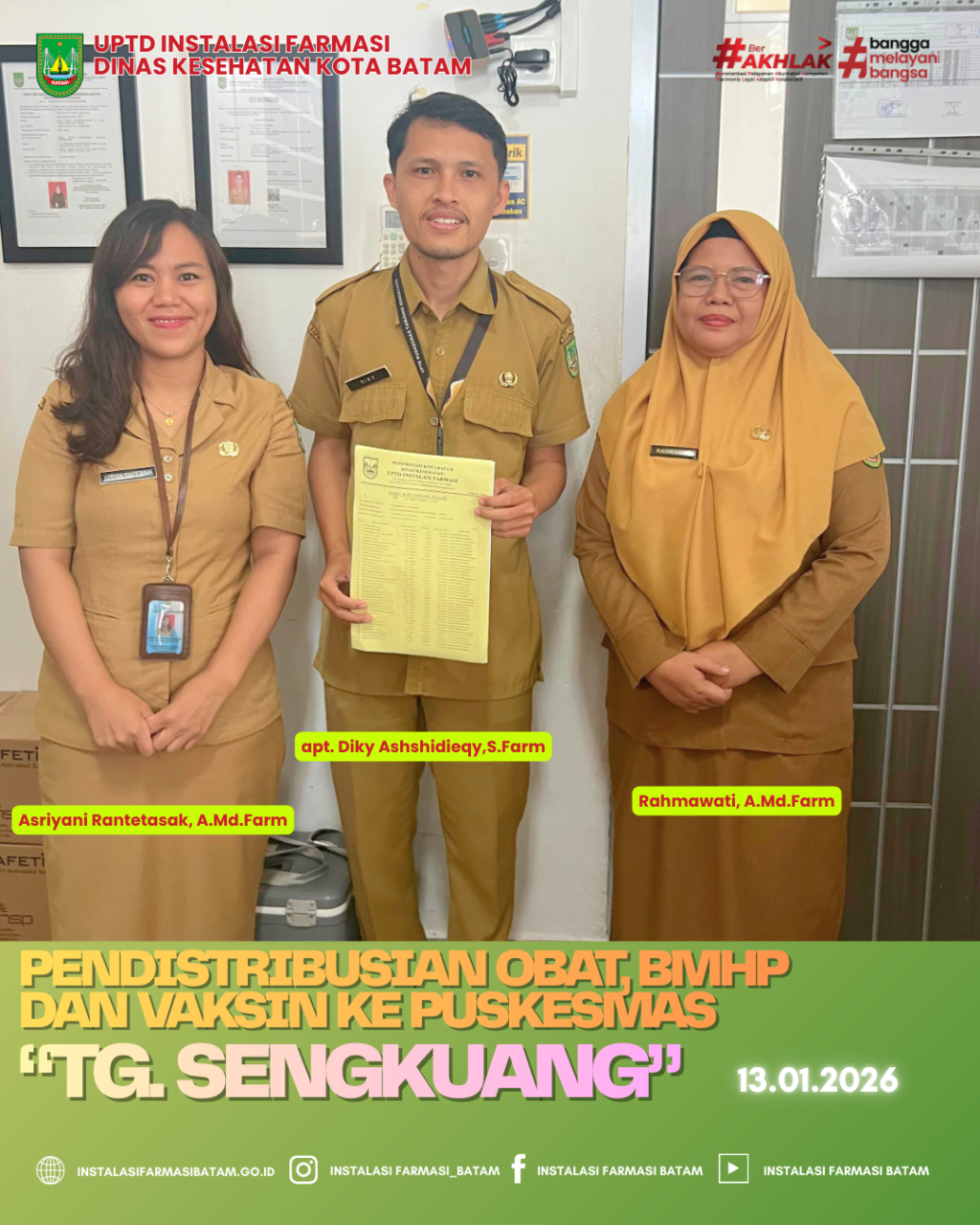 UPTD Instalasi Farmasi Dinas Kesehatan Kota Batam melakukan Pendistribusian Obat, Bahan Medis Habis Pakai (BMHP) dan Vaksin rutin ke Puskesmas Tg. Sengkuang pada Selasa, 13 Januari 2026