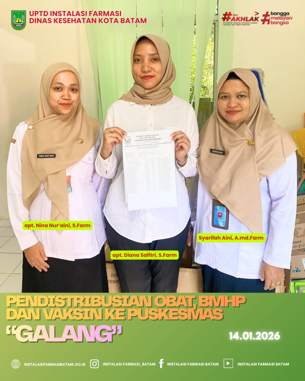 UPTD Instalasi Farmasi Dinas Kesehatan Kota Batam melakukan Pendistribusian Obat, Bahan Medis Habis Pakai (BMHP) dan Vaksin rutin ke Puskesmas Galang pada Rabu, 14 Januari 2026