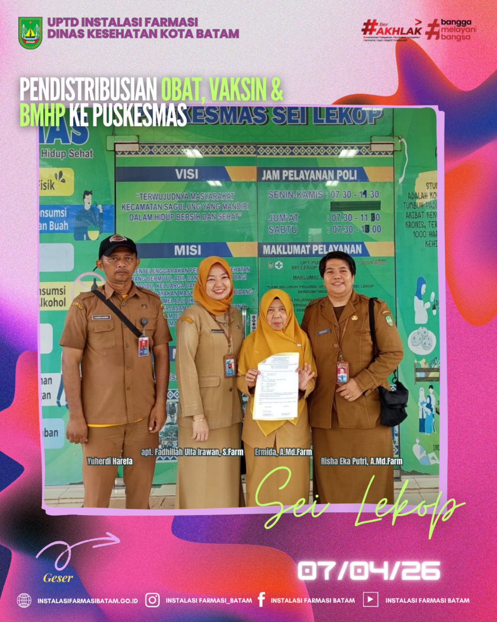 UPTD Instalasi Farmasi Dinas Kesehatan Kota Batam melakukan Pendistribusian Obat, Bahan Medis Habis Pakai (BMHP) dan Vaksin rutin ke Puskesmas Sei Lekop pada Selasa, 07 April 2026