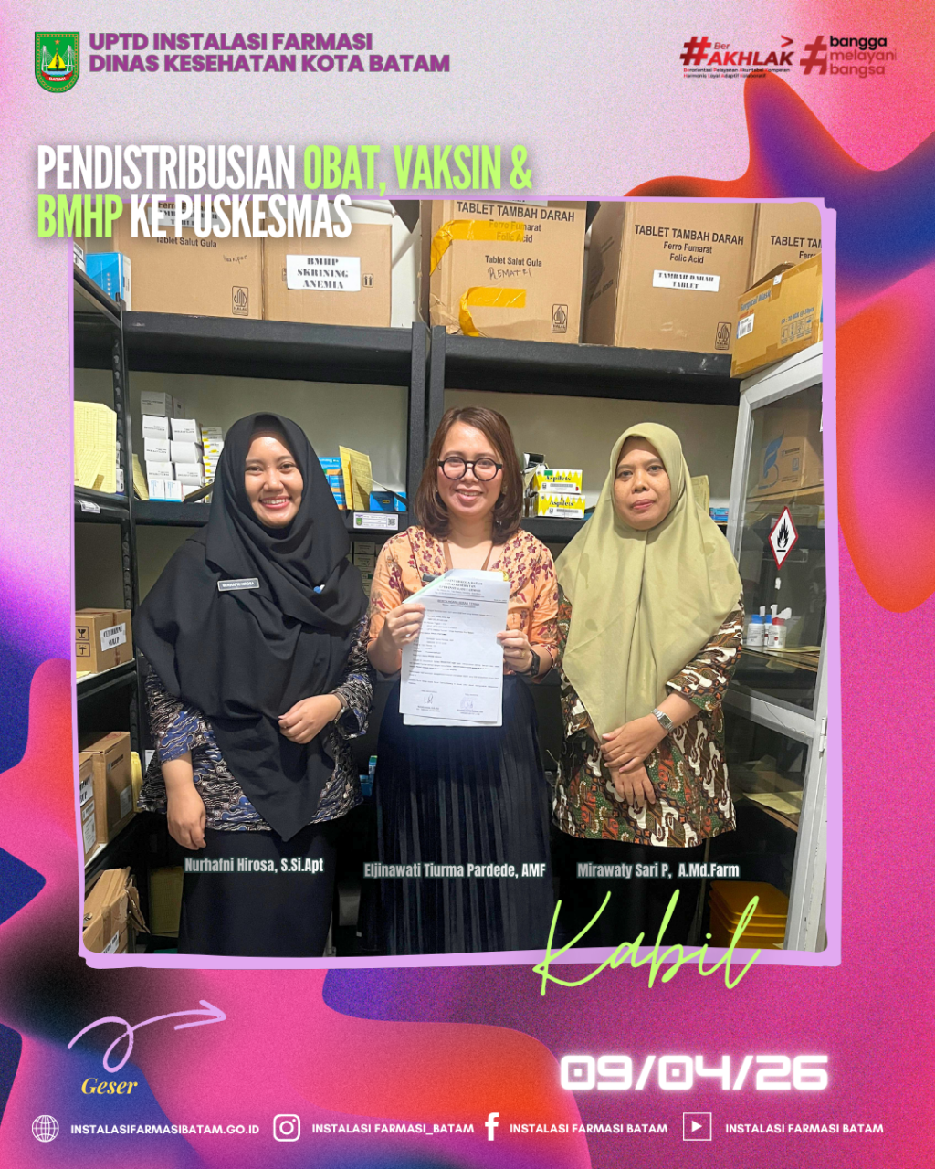UPTD Instalasi Farmasi Dinas Kesehatan Kota Batam melakukan Pendistribusian Obat, Bahan Medis Habis Pakai (BMHP) dan Vaksin rutin ke Puskesmas Kabil pada Kamis, 09 April 2026