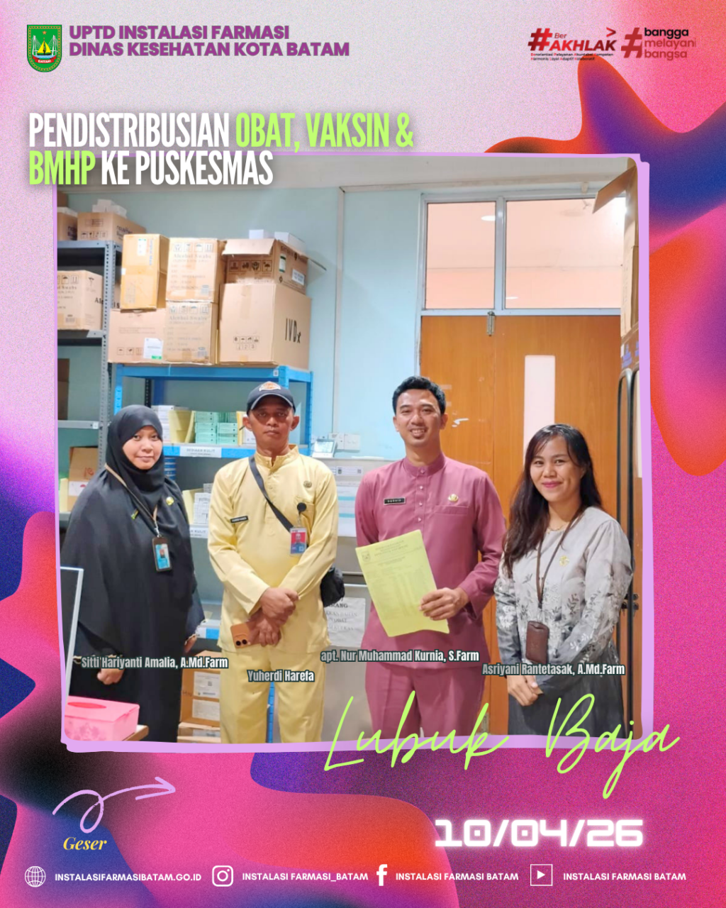 UPTD Instalasi Farmasi Dinas Kesehatan Kota Batam melakukan Pendistribusian Obat, Bahan Medis Habis Pakai (BMHP) dan Vaksin rutin ke Puskesmas Lubuk Baja pada Jum’at, 10 April 2026