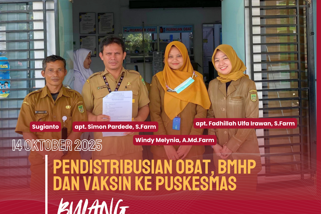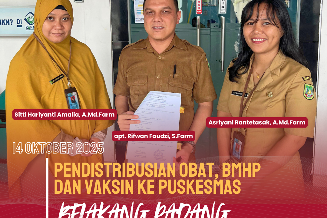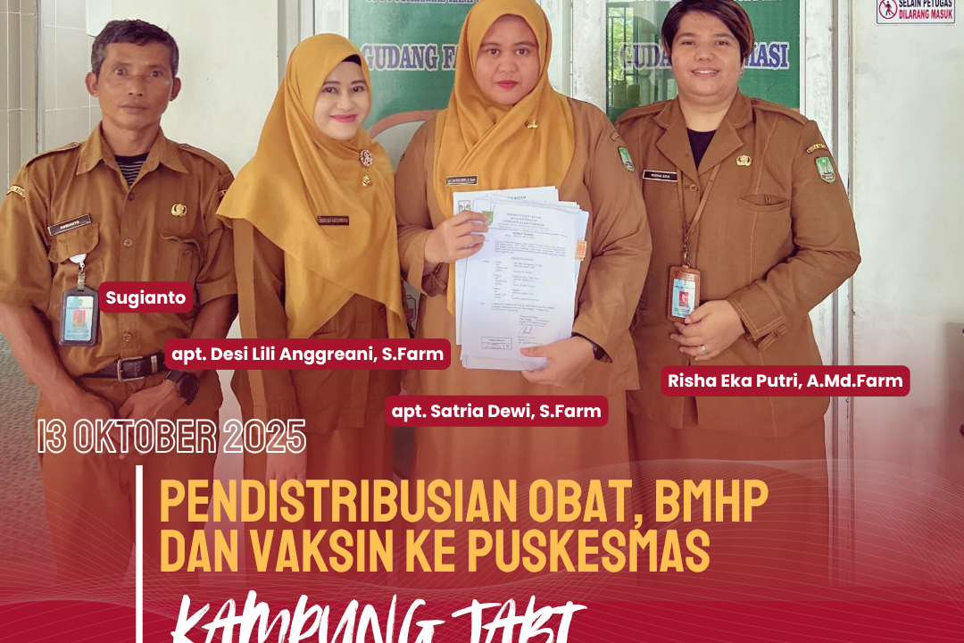 Pendistribusian Obat, BMHP dan Vaksin ini bertujuan untuk menjamin ketersediaan Obat, BMHP dan Vaksin untuk menunjang pelayanan kesehatan dasar kepada...